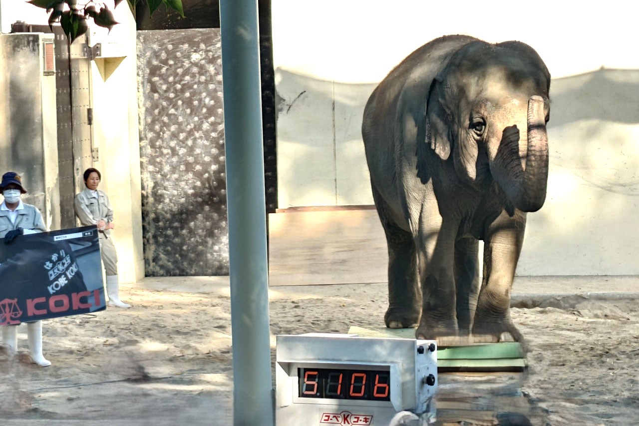 当日は晴天に恵まれ、アジアゾウの「ズゼ」(メス)が14時30分から屋外運動場の体重計に乗り、体重4750kgが記録されました。