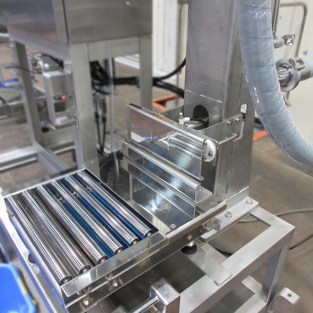 容器はローラー付き計量器に載せられ、設定重量になるとプッシャーが容器を前方へ自動排出。